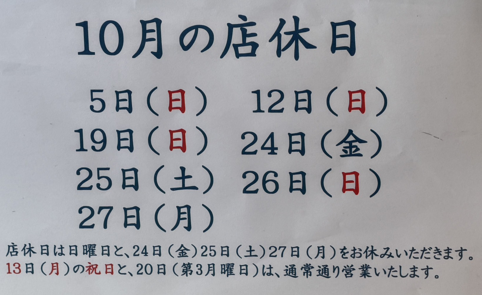 2025年10月01日 10月の店休日について お知らせ 10月は下記日程が店休日となります。 10月5日(日)10月12日(日)10月19日(日)10月24日(金)10月25日(土)10月26日(日)10月27日(月)※店休日は日曜日と、24日(月)25日(土)27日(月)をお休みいただきます。13日(月)の祝日と、20日(月)第3月曜日は通常通り営業いたします。
