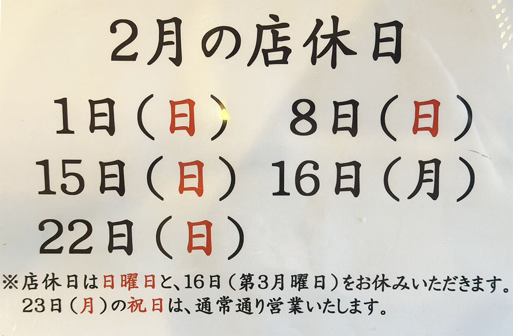2026年01月30日 2月の店休日について お知らせ 2月1日(日)2月8日(日)2月15日(日)2月16日(月)2月22日(日)※店休日は日曜日と、16日(第3月曜日)をお休みいただきます。 23日(月)の祝日は、通常通り営業いたします。